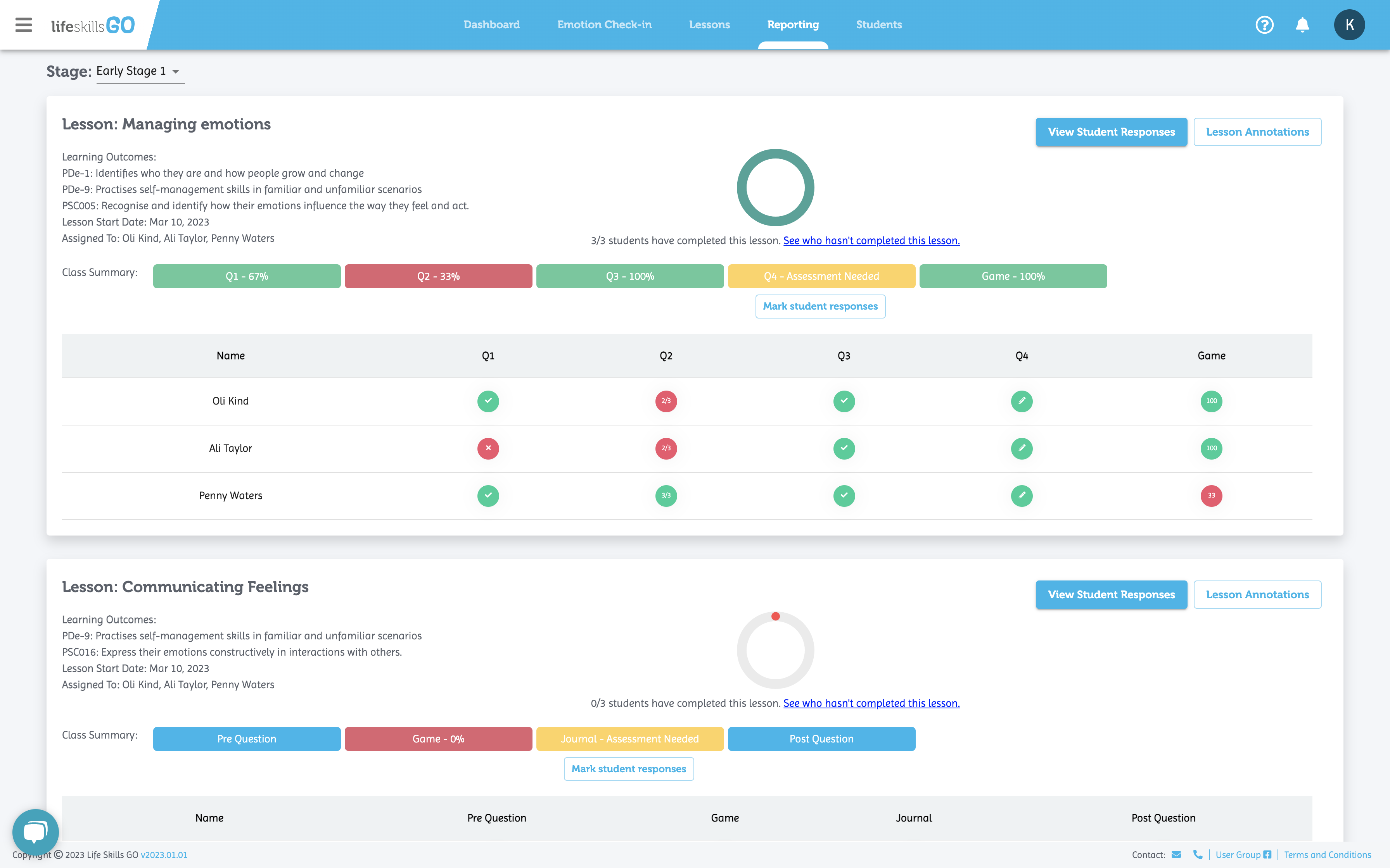 From the dashboard select Reporting to bring up the class’s assigned lessons.
